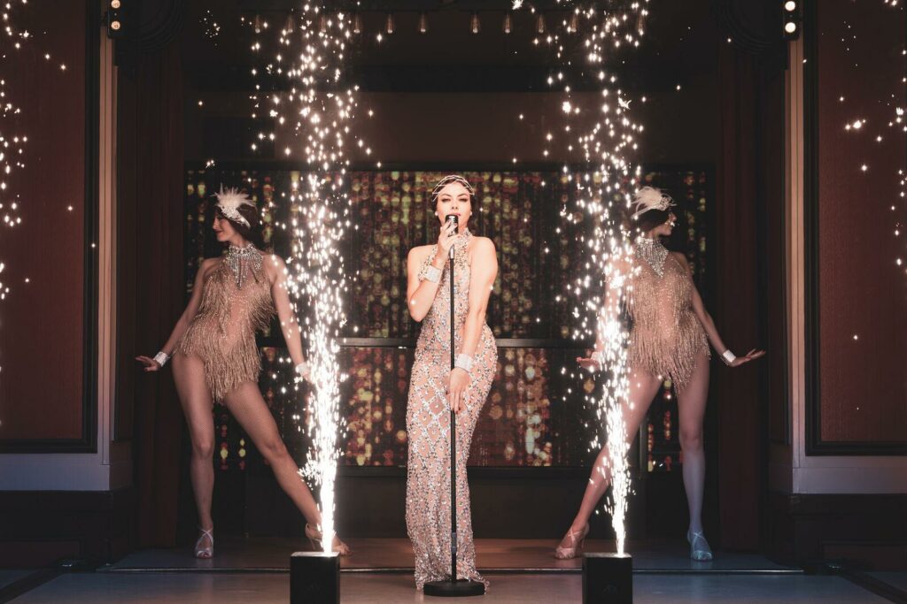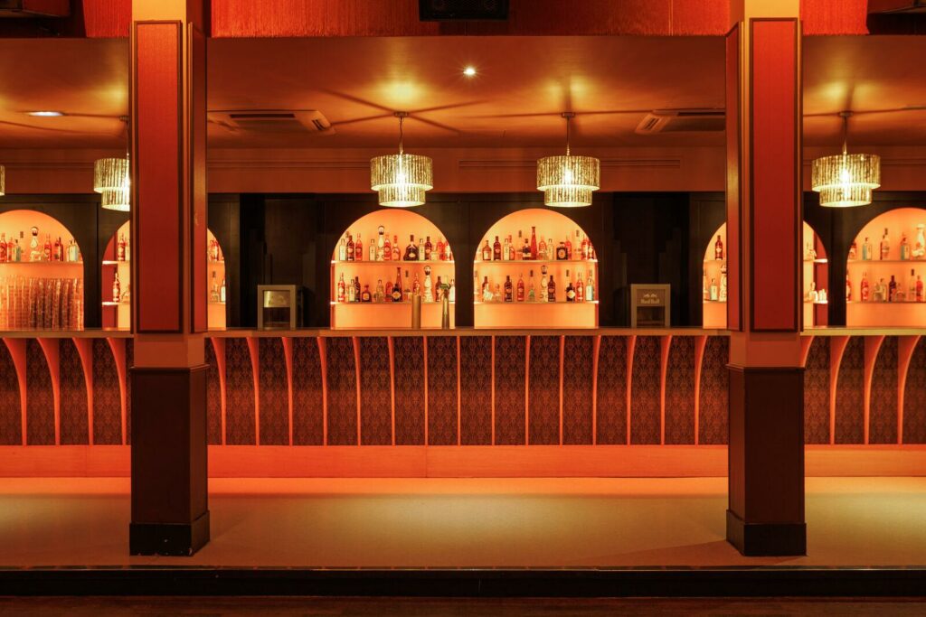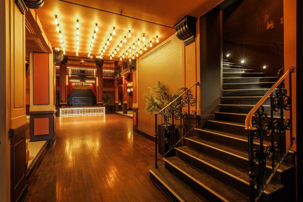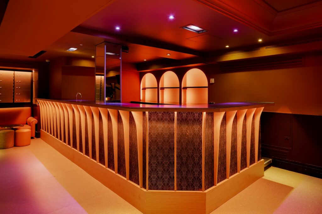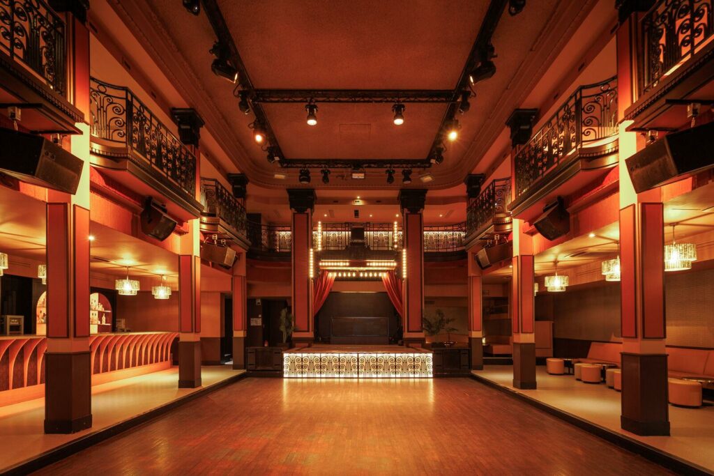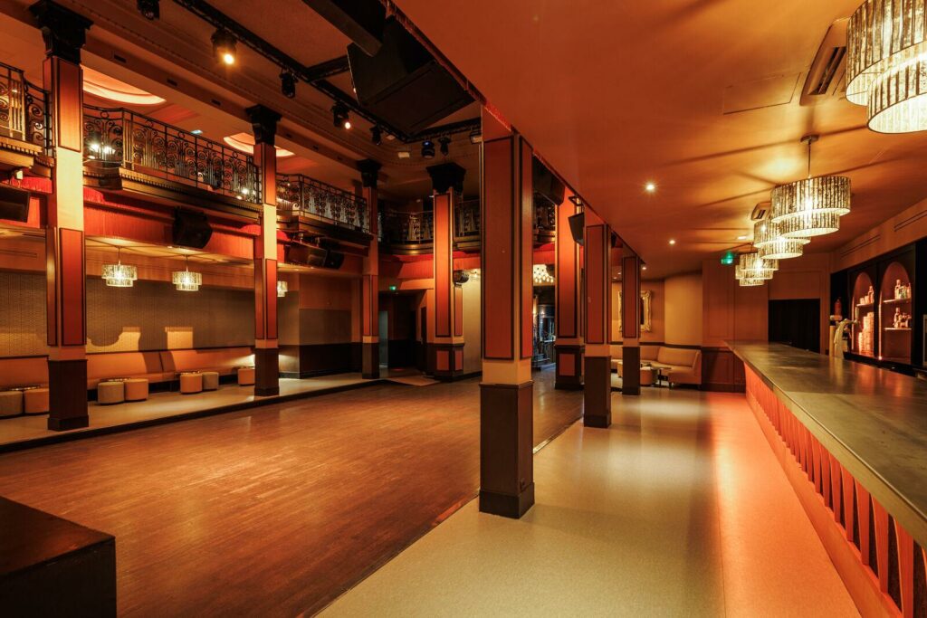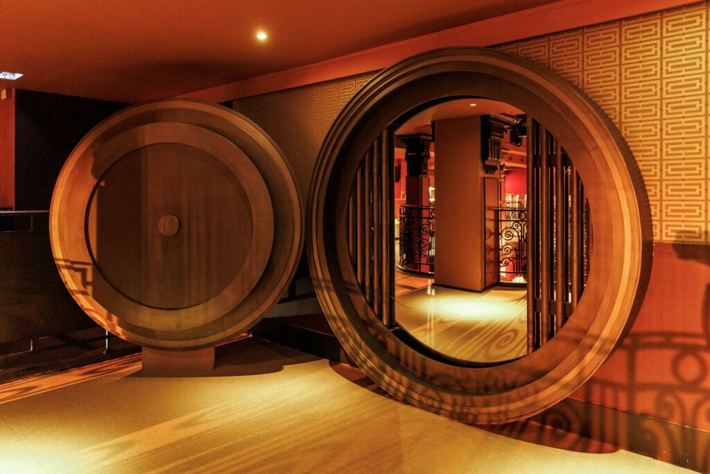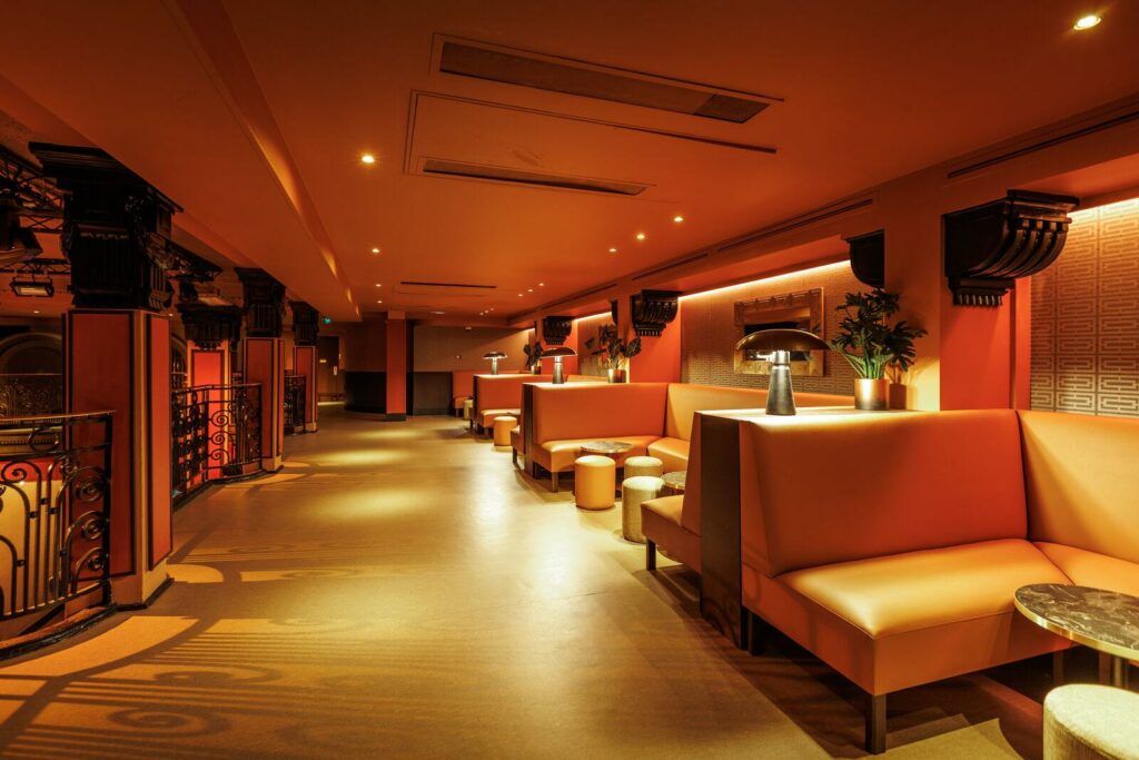 Cet espace événementiel a réussi à préserver ses éléments architecturaux d’origine tout en y intégrant une touche de modernité. L’impressionnante hauteur sous plafond, les balustrades en fer forgé, la massive porte du coffre-fort et les ornements art déco de l’ancienne banque ont été rénovés. Ces éléments sont harmonieusement combinés avec des touches modernes telles que des meubles et décorations inspirés des cabarets et music-halls d’autrefois, créant une ambiance intime et accueillante.