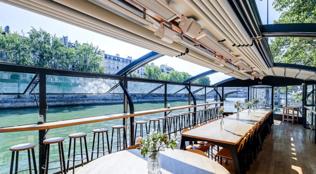 Péniche avec toit ouvrant et des espaces en terrasse, Les Maquereaux Rive Droite c’est une expérience unique au coeur de Paris en face l’Île St Louis.