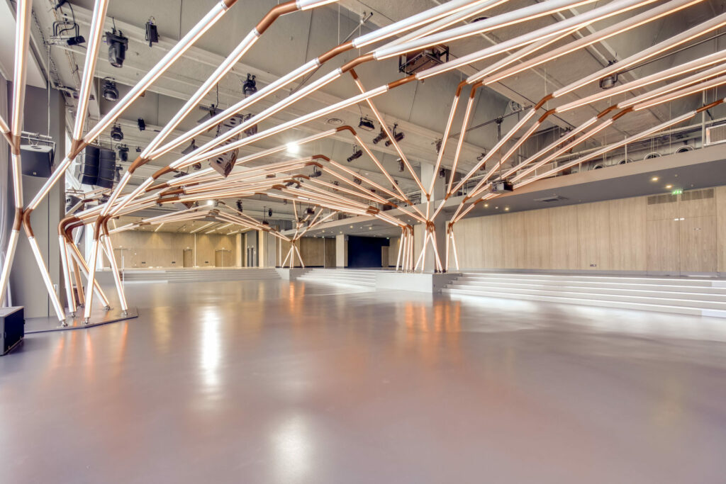 Le projet architectural du Terminal 7 est incarné par l’œuvre magistrale de l’artiste brésilien Guto Requena. Cette structure monumentale habille tout l’espace et représente un arbre inversé dont les racines prennent ancrage dans le ciel, diffusant des lumières multicolores électrisantes.